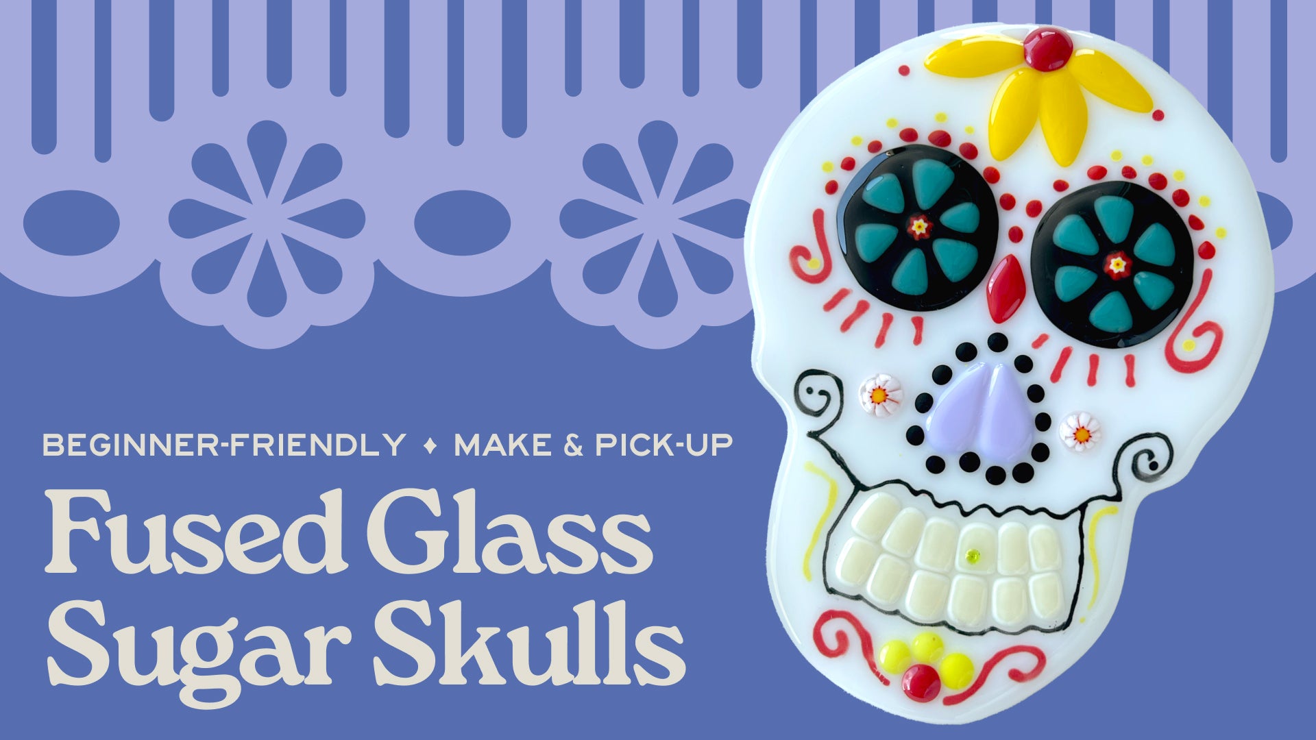 In this 2 1/2 hour beginner fusing class, you will get to make a sugar skull on a pre-cut white glass base and decorate with glass embellishments and even paint. There will be template (about 5”x 6 1/2”) sent via email after sign-up so that you can start designing at home before the class. Pinterest can be very helpful, just search for ”sugar skulls" or "Día de Muertos skulls" for inspiration on these thousands of years old motifs!