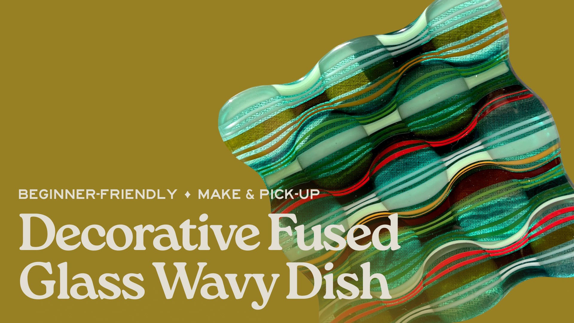 Create a fun and cool wavy dish using an “optical illusion” technique! Students will create a 5x5" decorative wavy dish using colored glass stringers and clear squares to manipulate the way glass pools when brought to a full fuse. The clear glass will collapse and pool in the area of the squares, and you will see the stringers stretch out and create an awesome fish-eye effect!